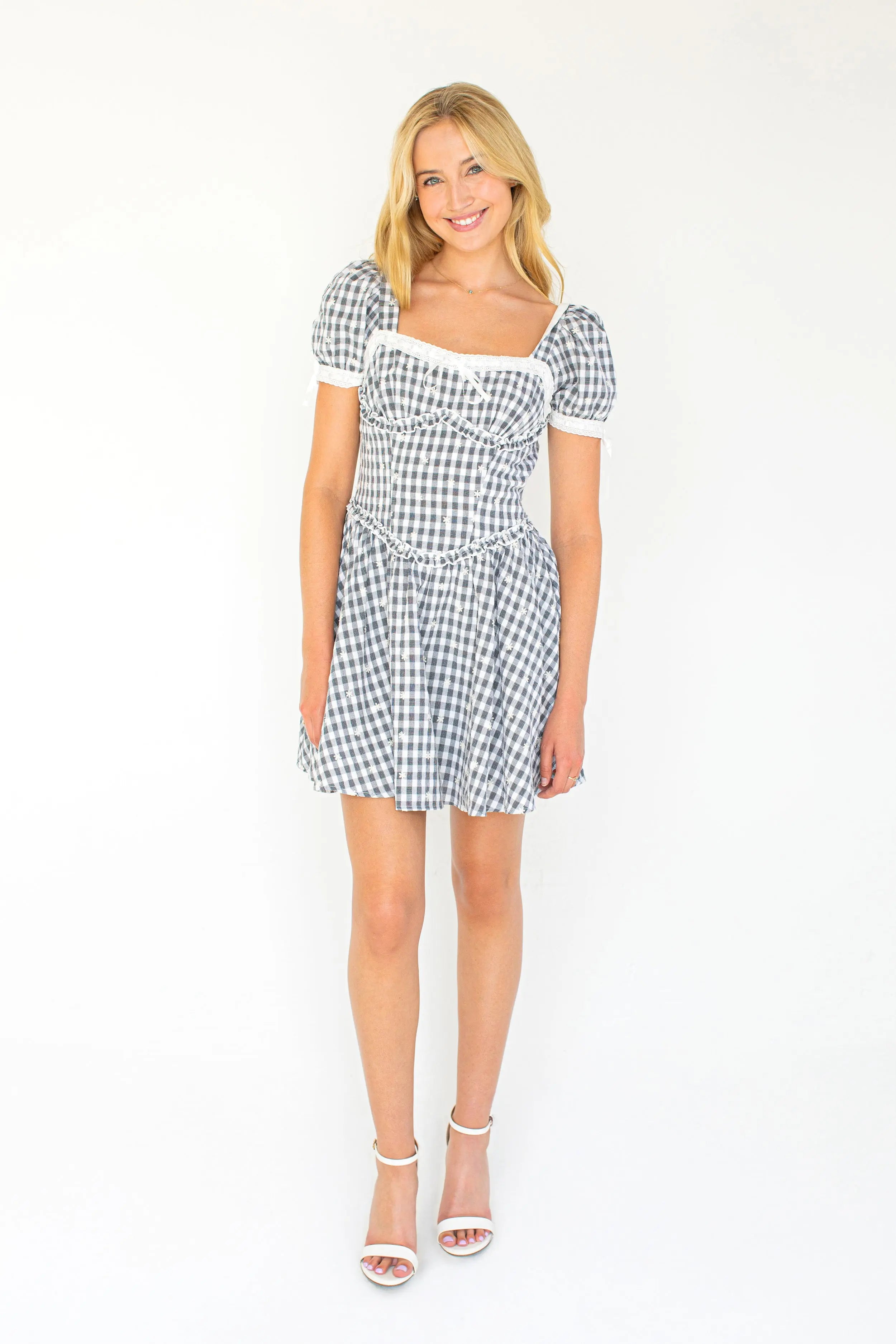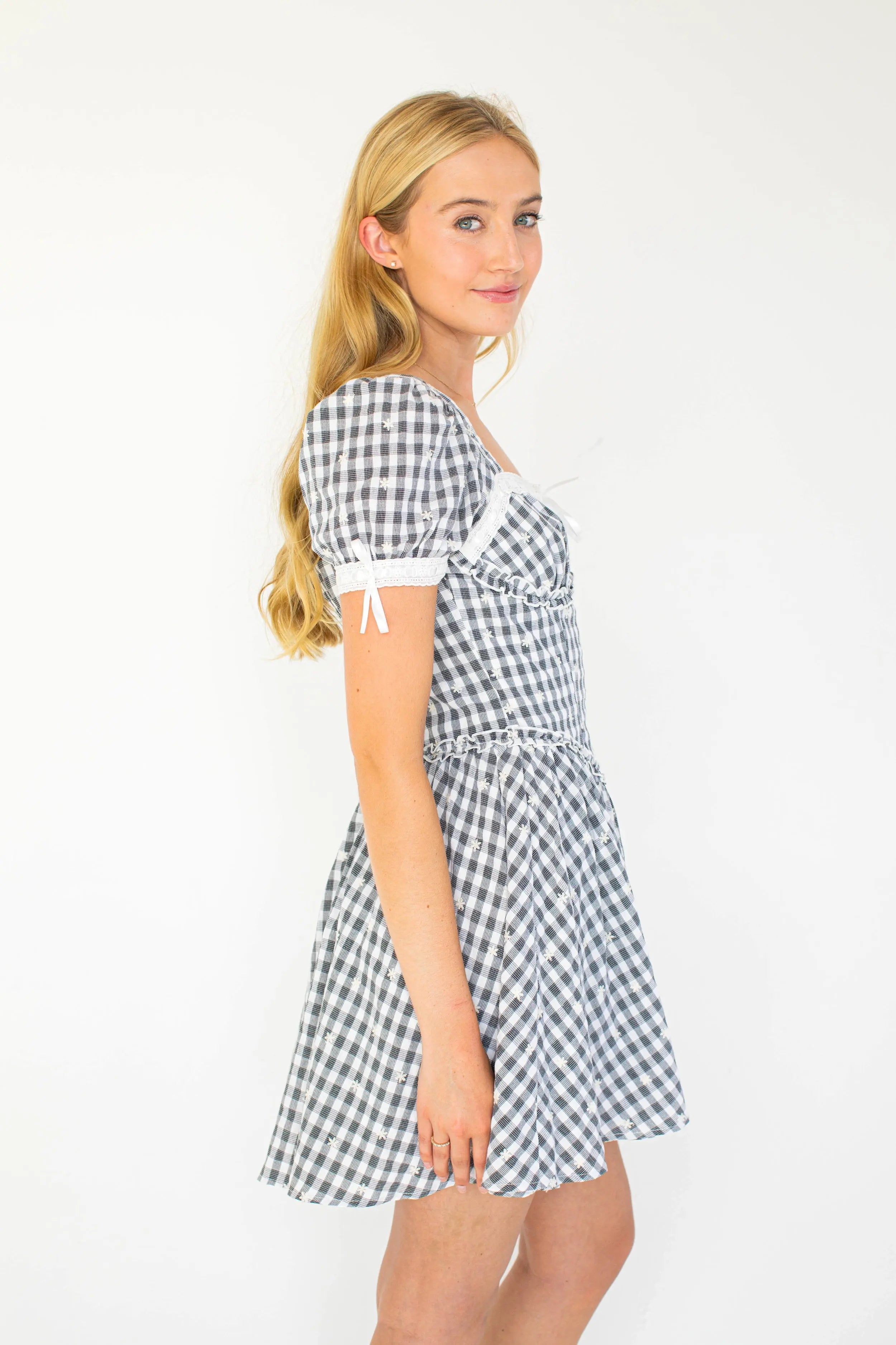 The Maeve Dress is your perfect fall companion, blending timeless autumn motifs with a fresh twist. Beautiful embroidery dances across classic black and white gingham, while playful puff sleeves and a delicate ribbon detail along the bust bring charming, feminine flair. Embrace cozy elegance with this dress made for crisp days and warm smiles.