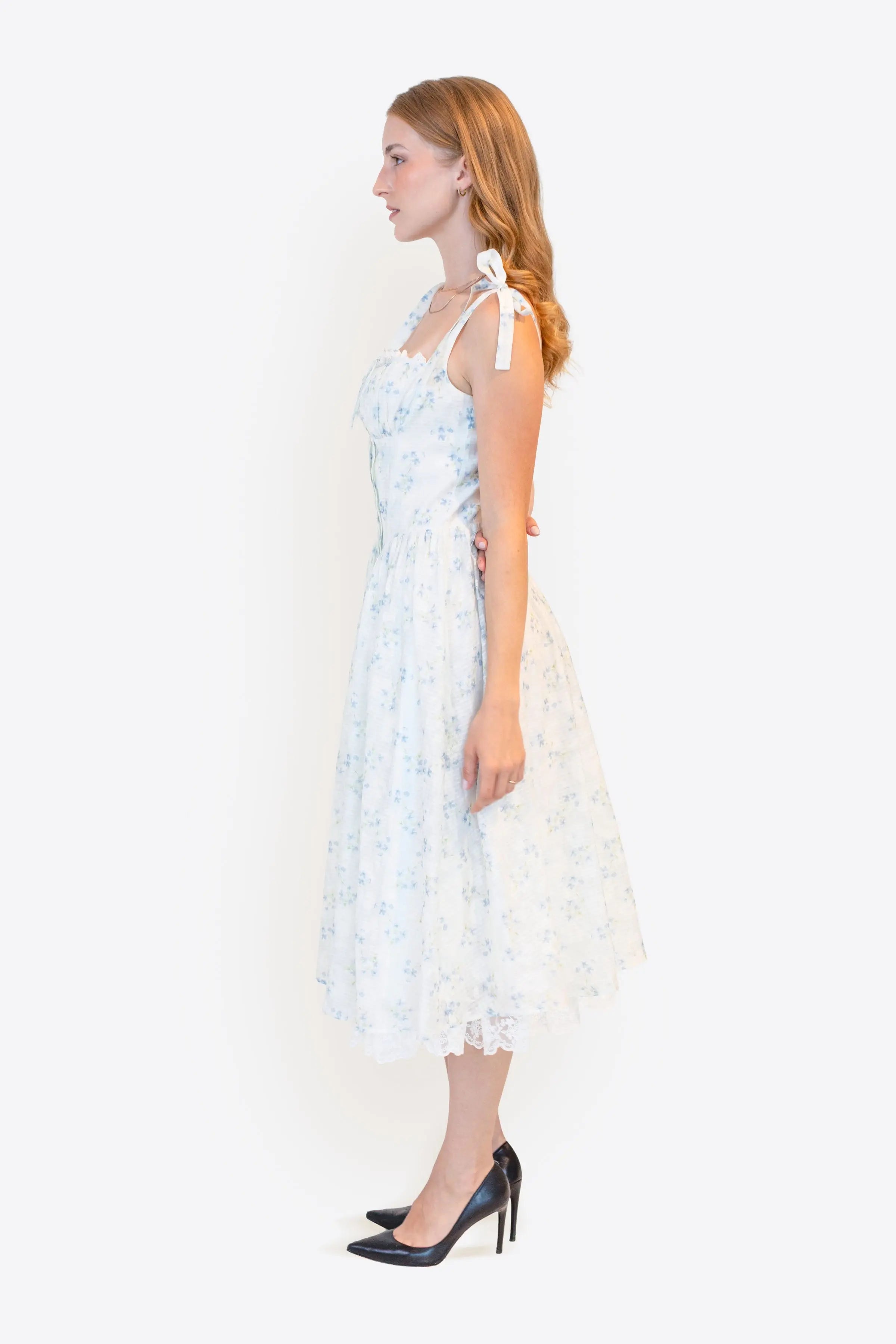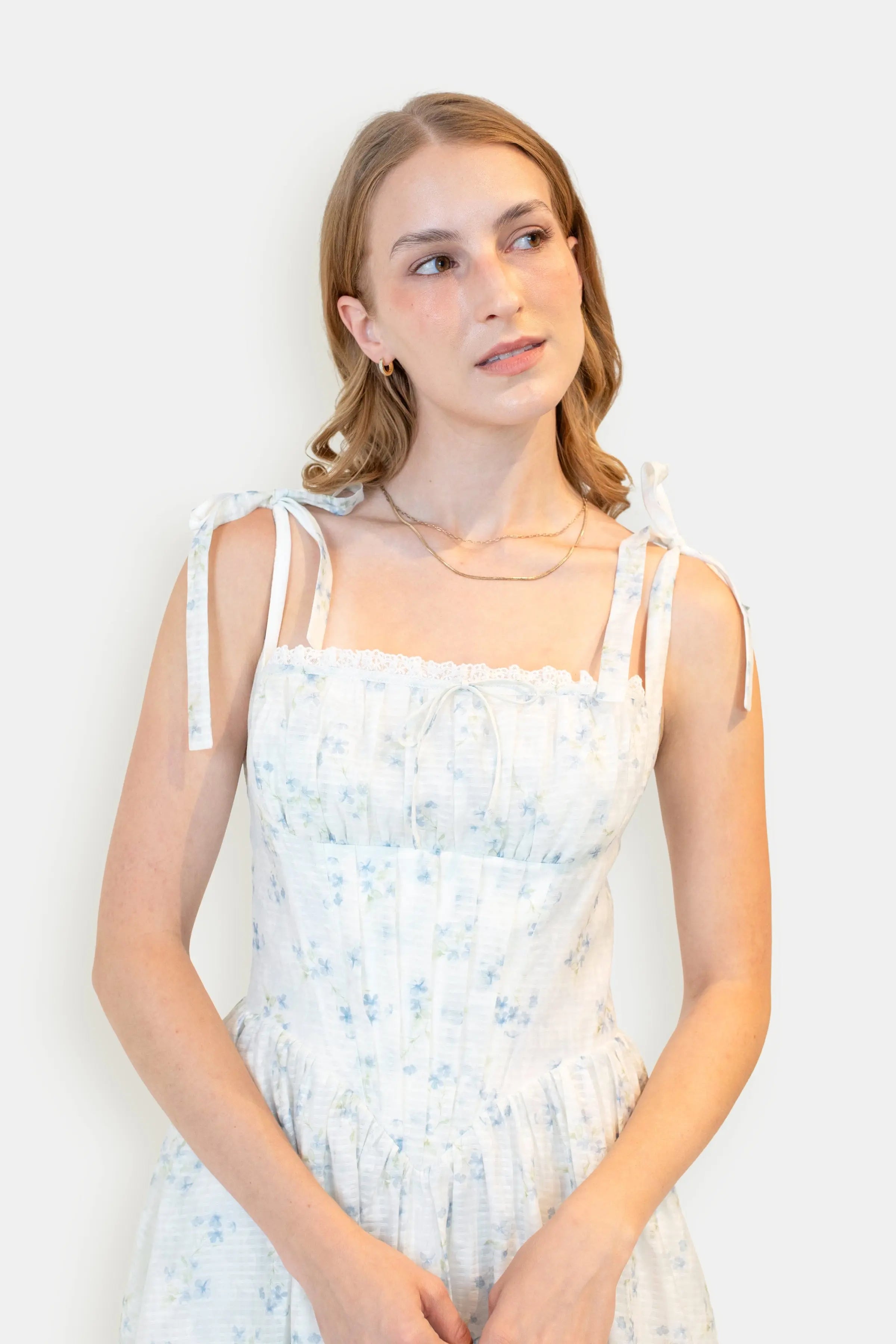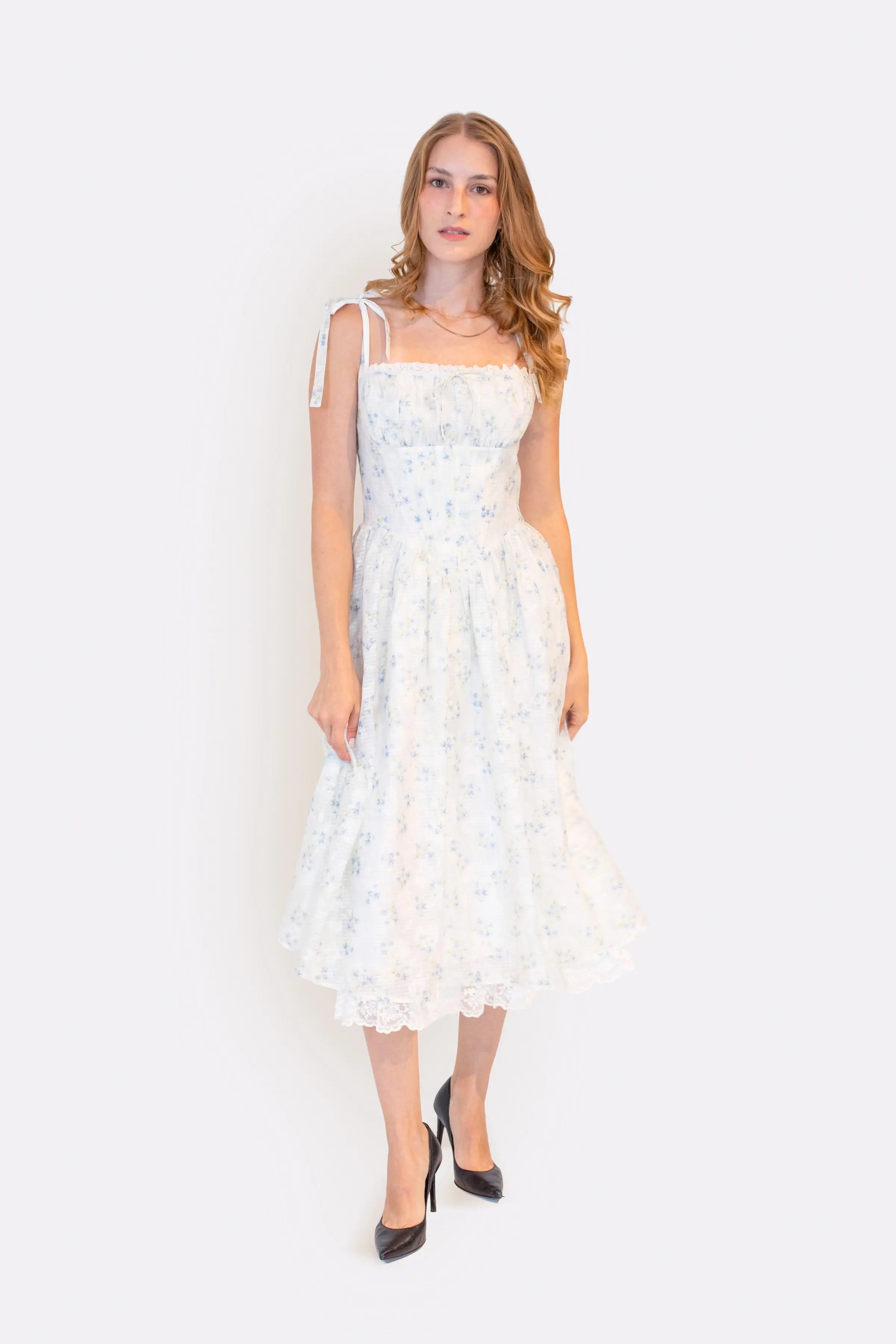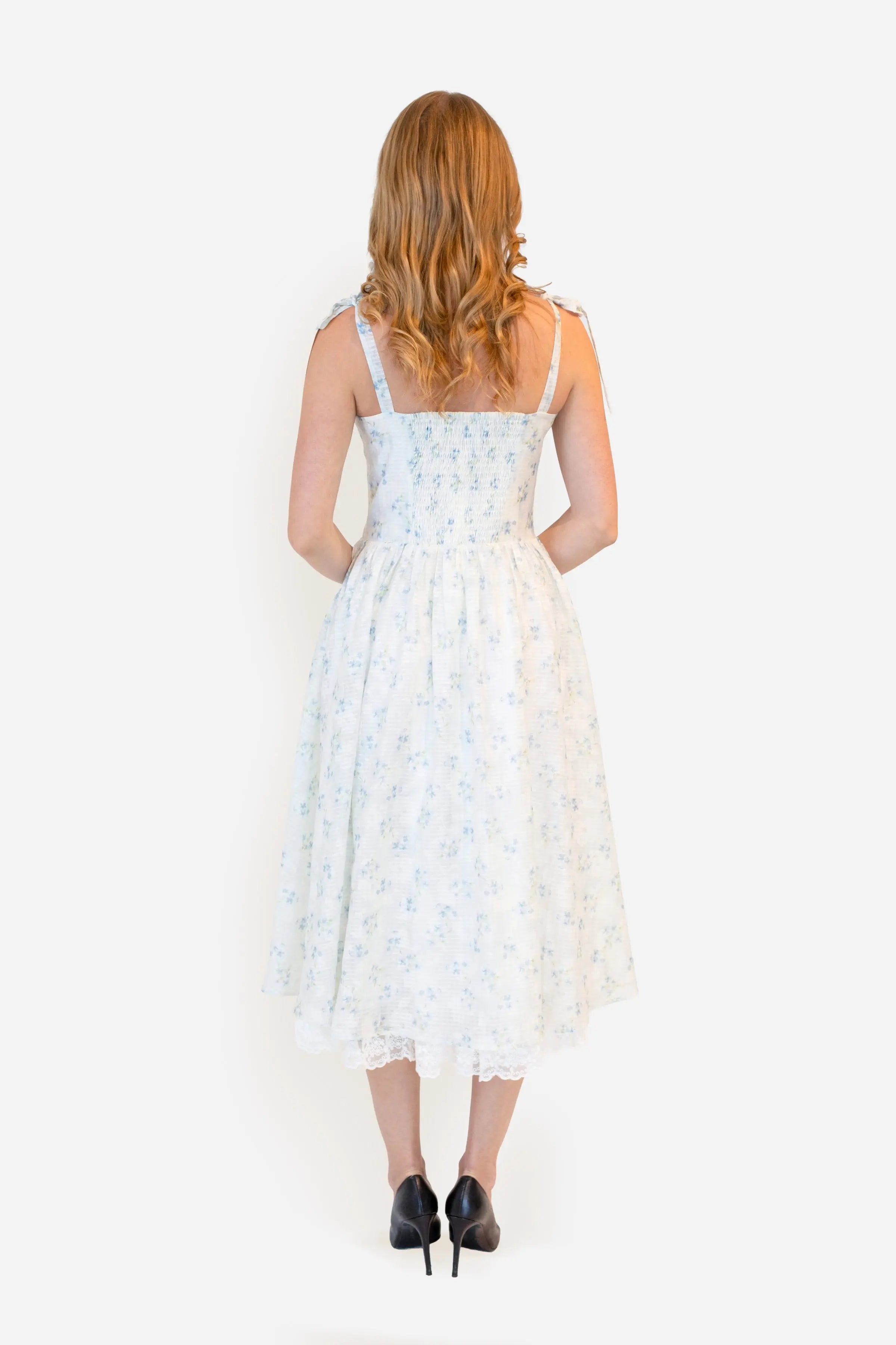 The Vanessa Dress brings winter florals to life with a soft, subtle print inspired by the first frost on flowers. Its playful pleating detail at the bodice adds a flattering touch, making this dress a whimsical twist on cold-season style.