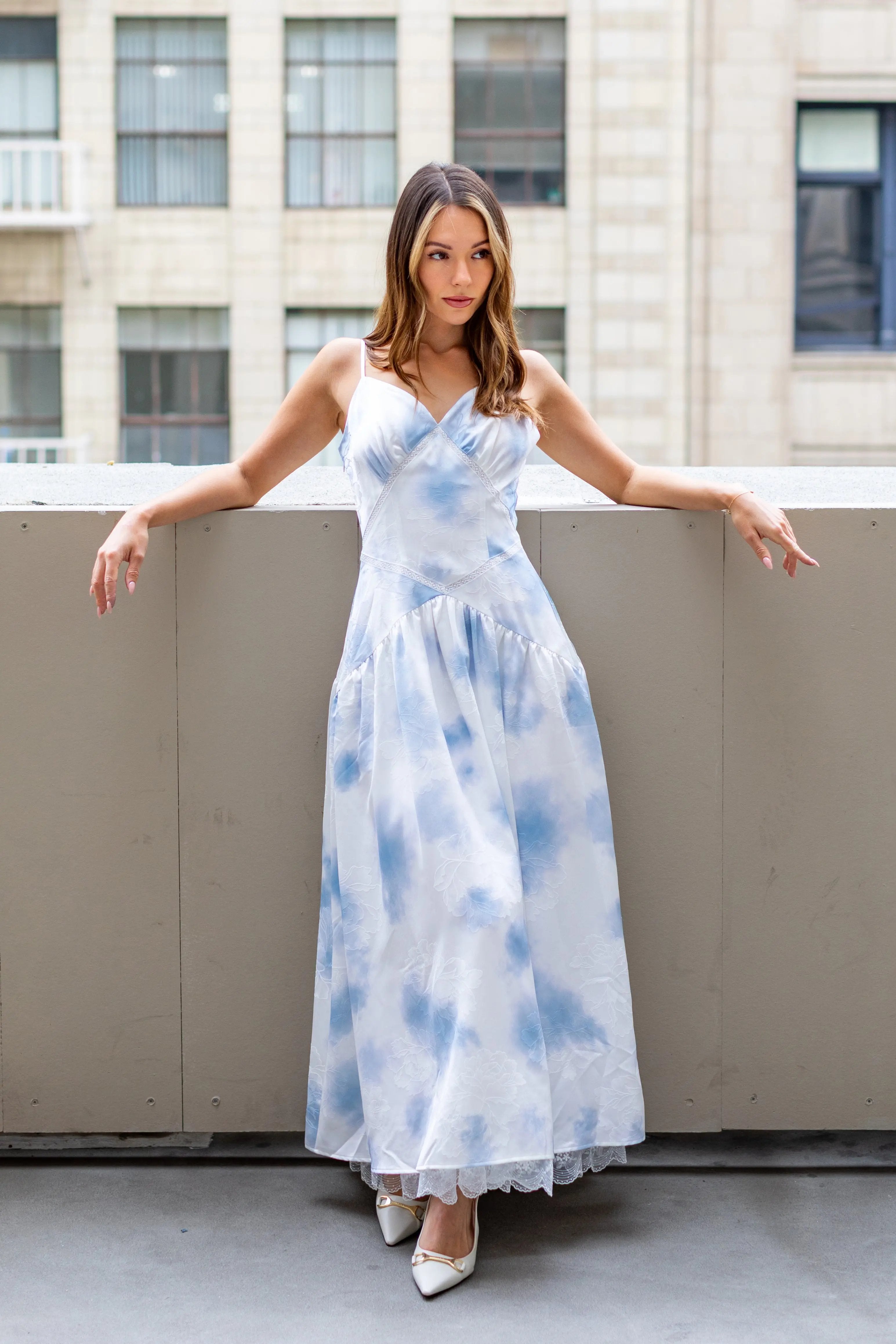The Saylor Dress features a delicate marbled blue and white pattern that exudes understated elegance. Its silky fabric drapes effortlessly, complemented by a flattering diamond-shaped lace trim at the bodice for a refined silhouette. This dress offers a sophisticated yet effortless look, perfect for occasions where you want to feel both graceful and elevated.