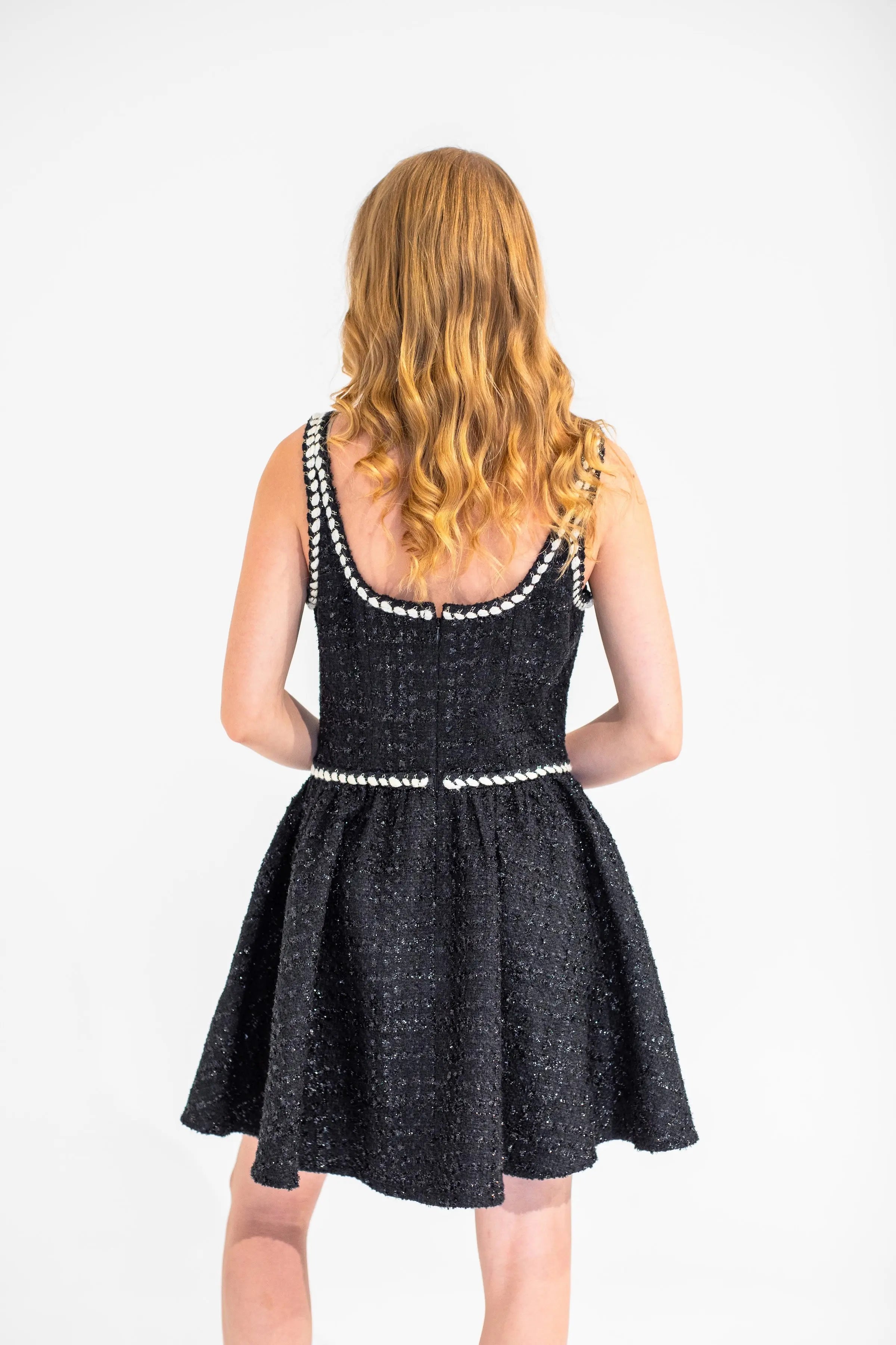 Elevate your style with the Charli Dress. This classy black tweed dress that brings elegance with a playful twist. Featuring unique white contrast piping that sparkles subtly, this dress turns a classic look into something effortlessly chic and fun.