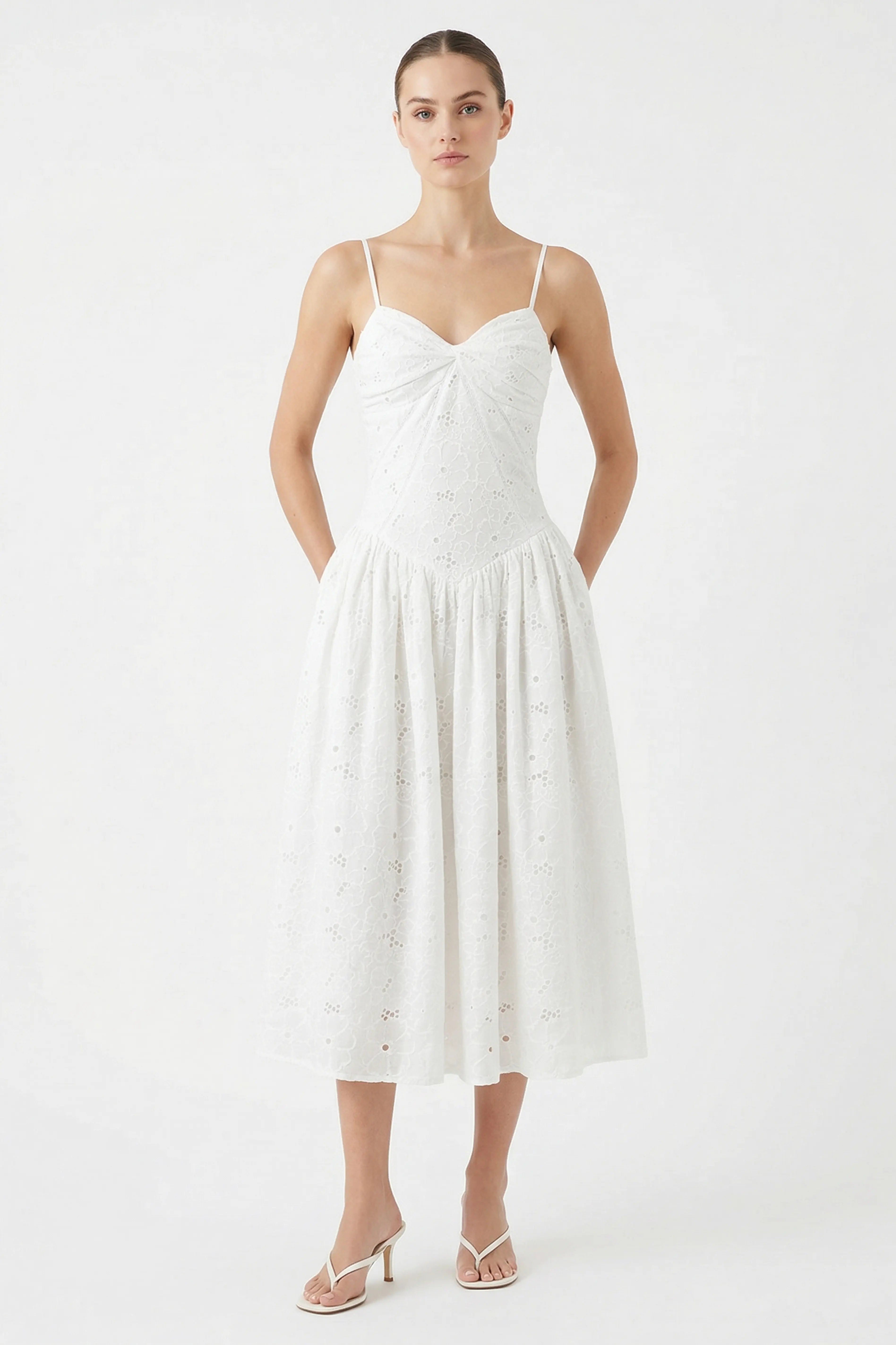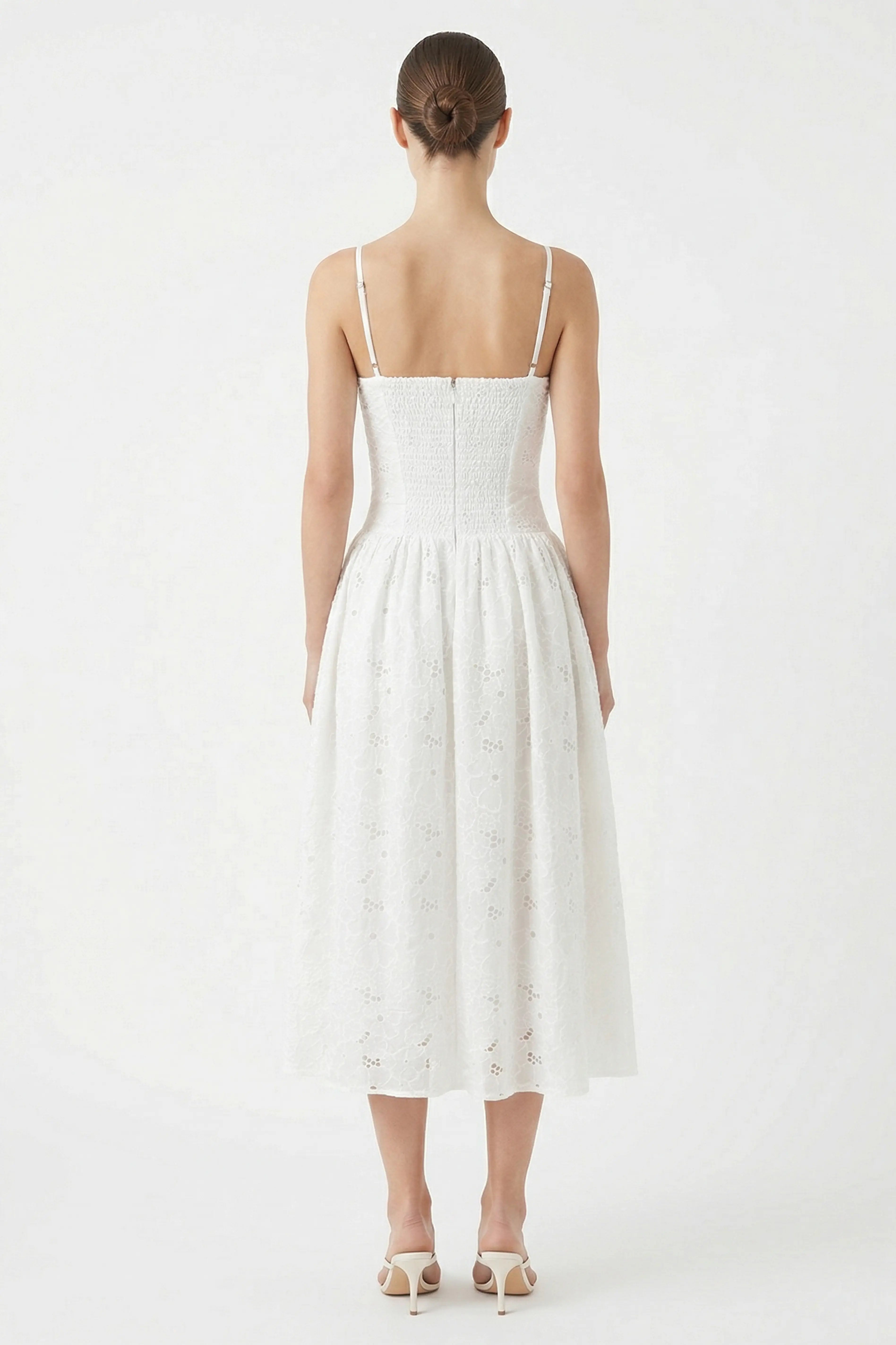 The Magnolia Dress is a breezy eyelet midi in a soft white, designed with a fitted bodice and a gathered skirt for an effortlessly feminine silhouette. Light, airy, and easy to wear, it’s the kind of piece you’ll reach for on warm days when you want to feel polished without trying too hard.